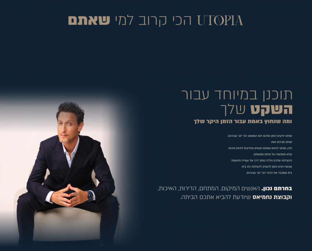 Landing page design for Utopia – a luxury real estate project in Tel Aviv’s Sde Dov neighborhood. The goal was to craft a premium, emotionally engaging experience that reflects the project’s exclusivity. Featuring renowned mentalist Lior Suchard as the brand ambassador, the page blends elegance with impact.